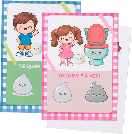O kit foi pensado exatamente para isso! O quadrinho “De Quem é a Vez” e a historinha “Tchau Fraldinha” trabalham o medo de forma lúdica e gradual.