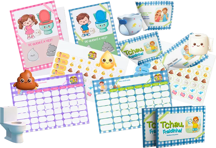 O kit foi pensado exatamente para isso! O quadrinho “De Quem é a Vez” e a historinha “Tchau Fraldinha” trabalham o medo de forma lúdica e gradual.